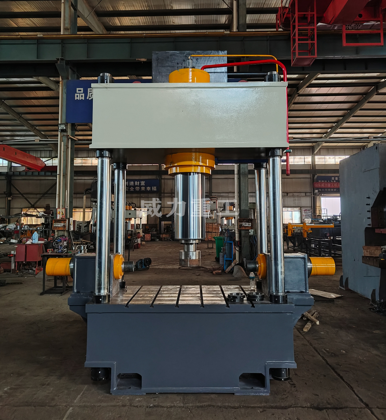 二梁四柱液壓機是一種常見的液壓機械設(shè)備,主要用于金屬材料的壓制成型、沖孔、剪切等工藝。它由兩個上下平行的梁和四根垂直的柱子組成,其中上梁和下梁通過液壓缸進行上下運動,柱子用于支撐和引導(dǎo)上下梁的運動。下面是二梁四柱液壓機的一般特點和工作原理: