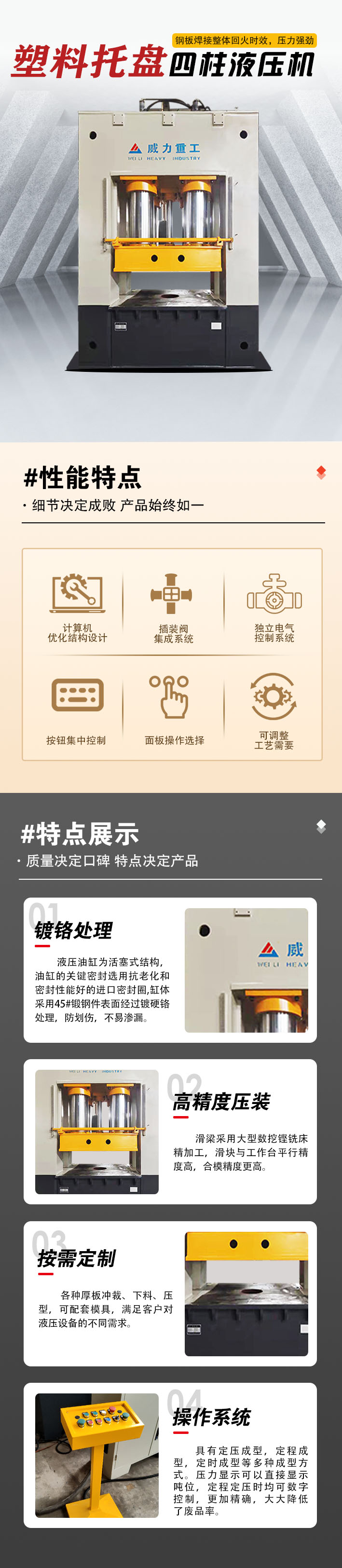 【產(chǎn)品描述】:塑料托盤成型液壓機是一種專門用于生產(chǎn)塑料托盤的設(shè)備。它采用液壓系統(tǒng),通過將熔化的塑料注入模具中,然后施加高壓力進行成型,最終得到塑料托盤產(chǎn)品。這種機器具有高效、精準(zhǔn)、穩(wěn)定的特點,能夠生產(chǎn)出高質(zhì)量的塑料托盤。 塑料托盤成型液壓機在物流、倉儲、包裝等行業(yè)中有著廣泛的應(yīng)用。塑料托盤是一種常用的物流包裝工具,可以用于存放、運輸和堆放貨物,提高